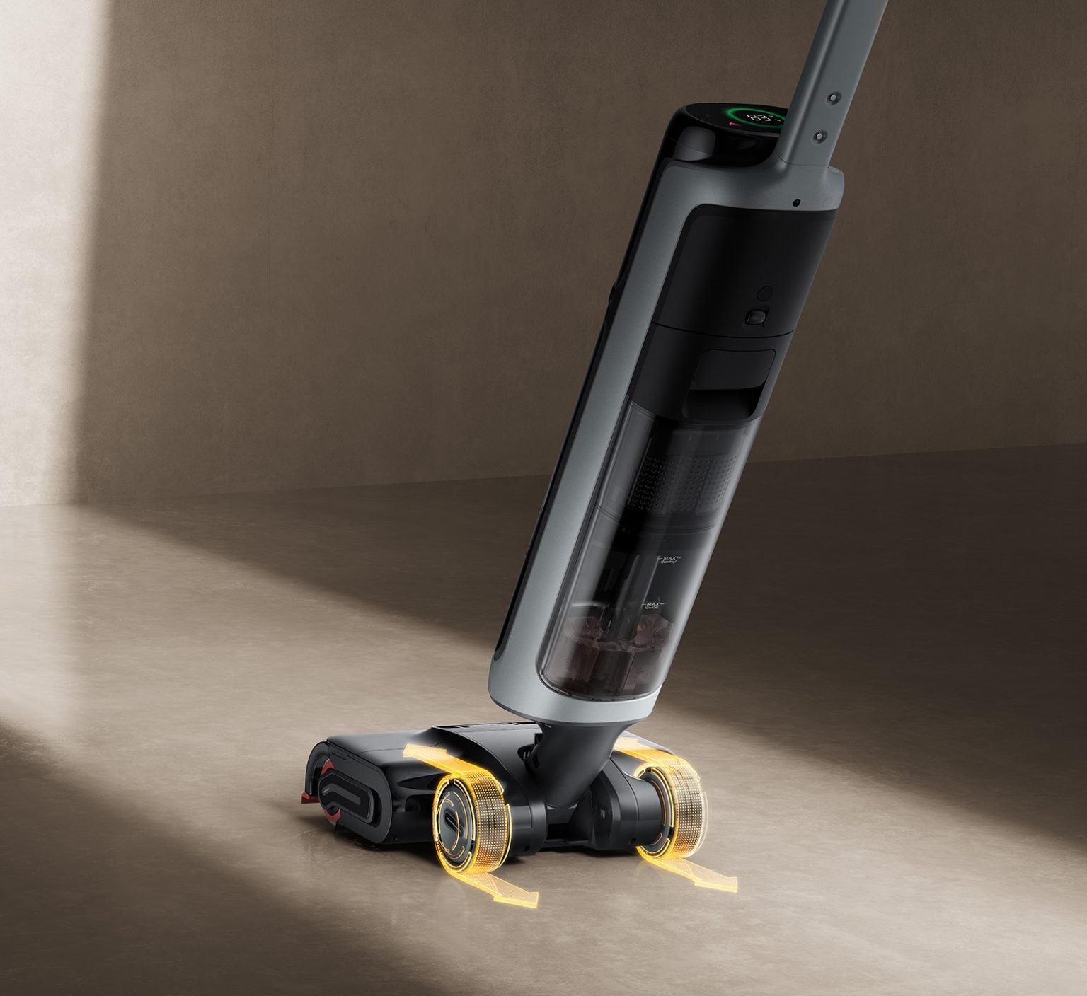 Главная инновация — система мойки горячей водой до 85°C, которая размягчает и удаляет стойкие загрязнения. Объем бака для чистой воды составляет около 800 мл, для грязной — до 650 мл в стоячем положении. Пылесос поддерживает несколько режимов: умный, сухая уборка, горячая мойка и ручной.