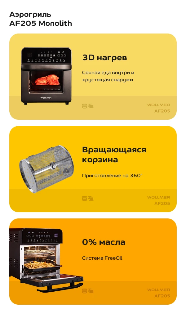 В 2026 году аэрогриль Wollmer AF205 Monolith активно позиционируется как один из лучших устройств с «эффектом русской печи» в среднем премиум-сегменте.