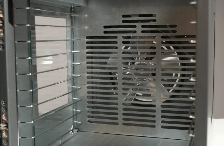 Прибор оснащен защитой от перегрева и функцией автоматического отключения. Горизонтальная подача воздуха обеспечивает равномерную сушку на всех уровнях без необходимости менять поддоны местами.